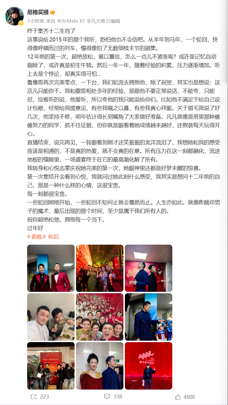 A+ A. A-2月17日凌晨,随着2026年中央广播电视总台春节联欢晚会的圆满落幕,中央广播电视总台主持人尼格买提也正式达成连续12年主持央视春晚的“里程碑”。随后,尼格买提在微博发文感慨:“终于集齐十二生肖了。”