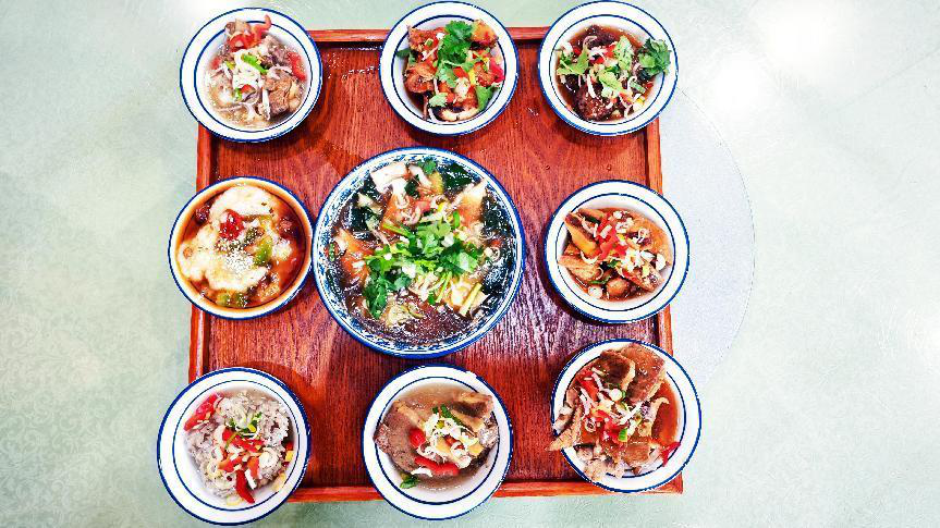 “九碗三行子”九只碗摆成方正三行,荤素搭配、色泽诱人。林如梦摄