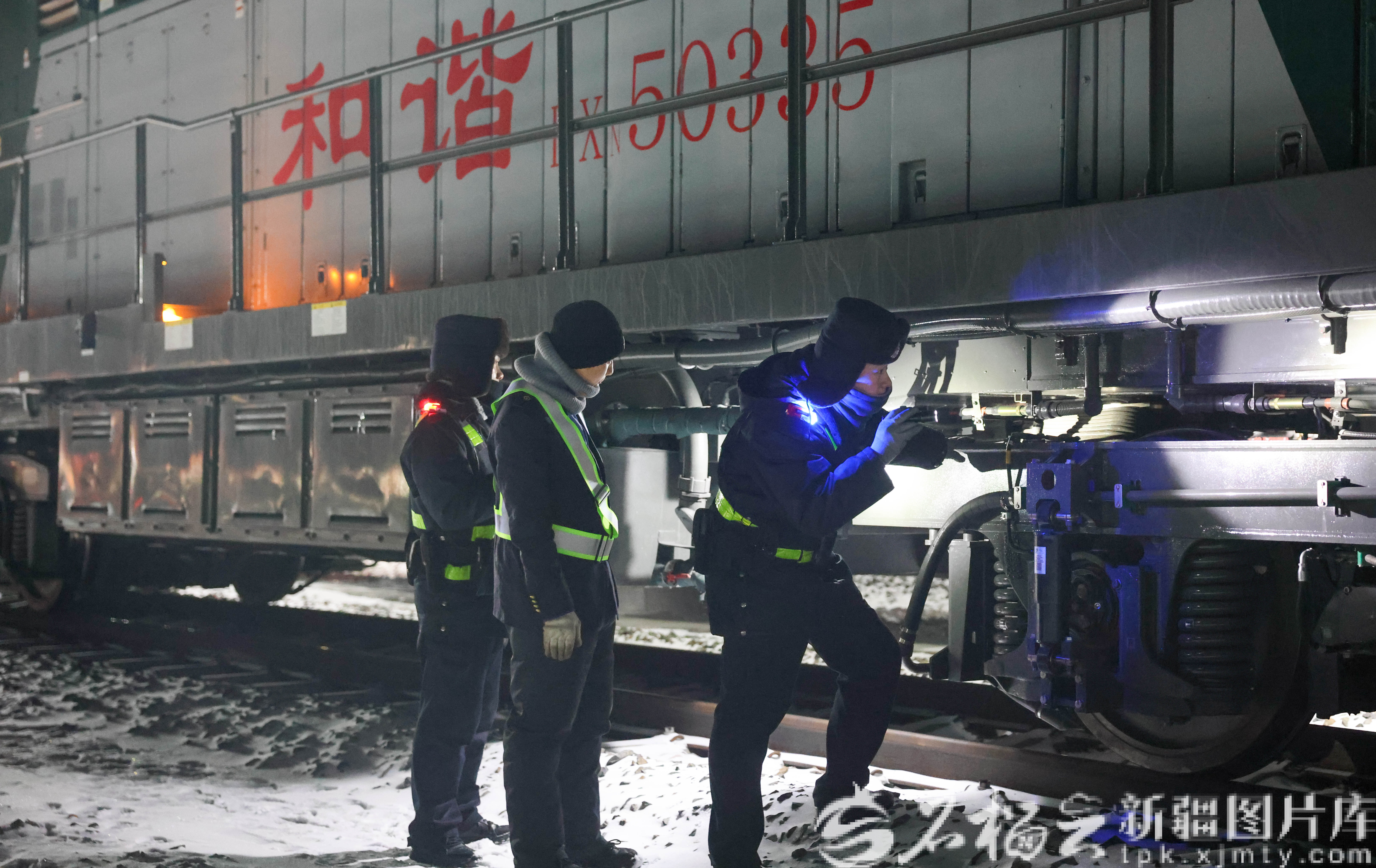 2月15日晚,阿拉山口边检站执勤民警在铁路口岸查验一辆出境班列。曹梦阳 摄