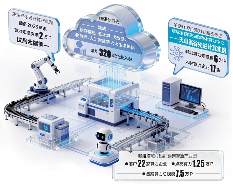 克拉玛依云计算产业园率先建成全疆首个算力规模超万P的产业集群,截至2025年末,算力规模突破2万P,位居全疆第一、西北前列,石油之城正转变为算力新城。