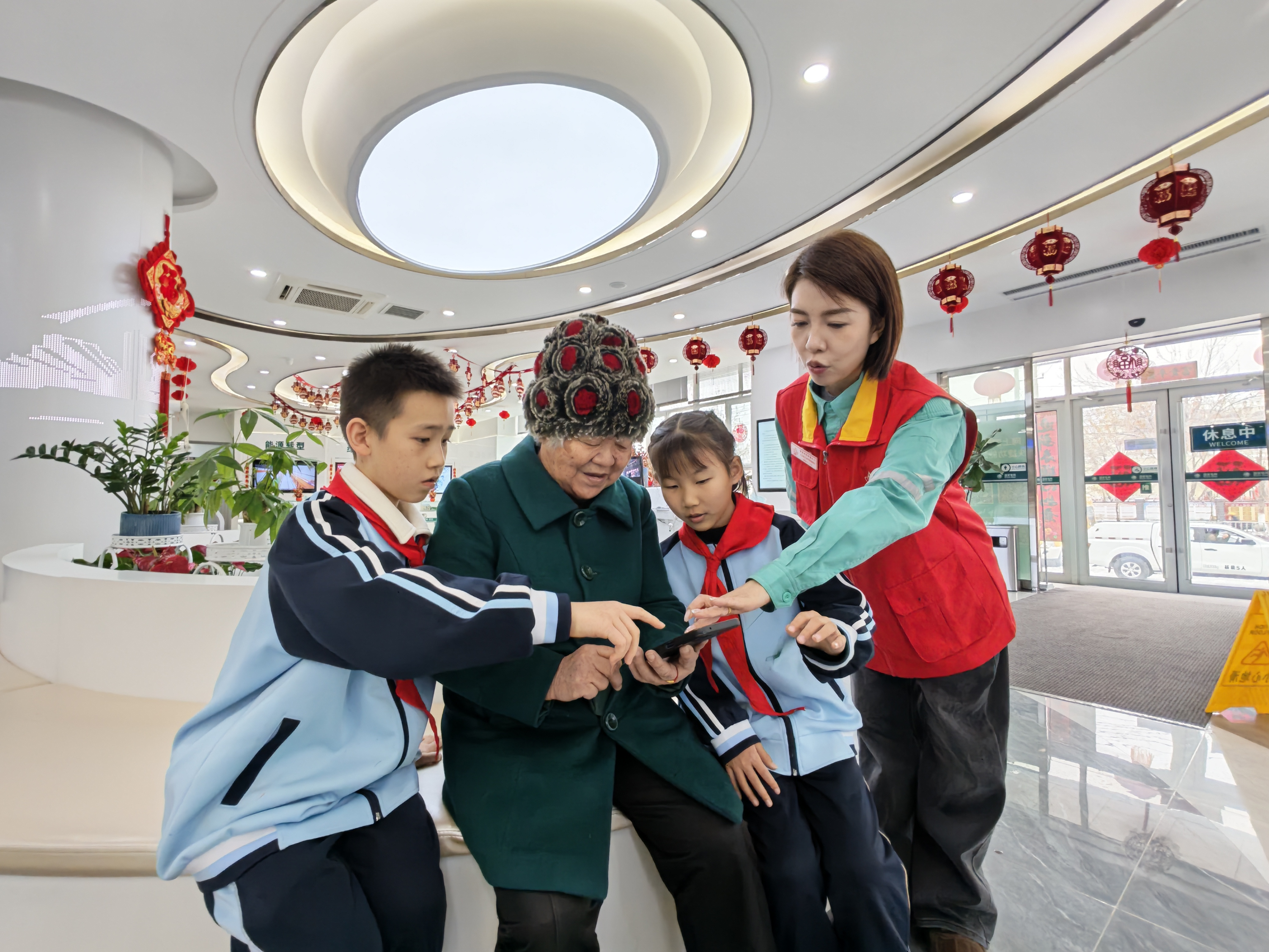 2月28日,在国网昌吉市供电公司雪莲营业厅,在志愿者指导下,小学生正在为市民网上缴费提供服务。祁世柱摄