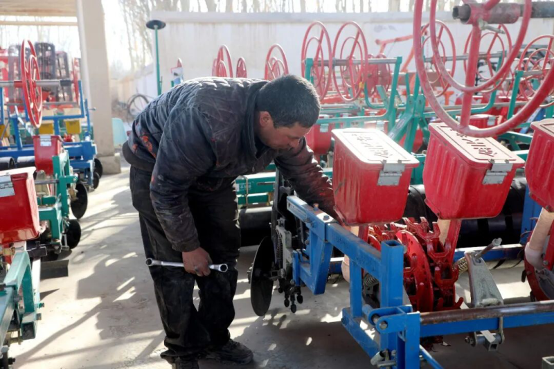 3月初,莎车县拍克其乡农机管理服务站工作人员正在检修农机。图/莎车县融媒体中心提供
