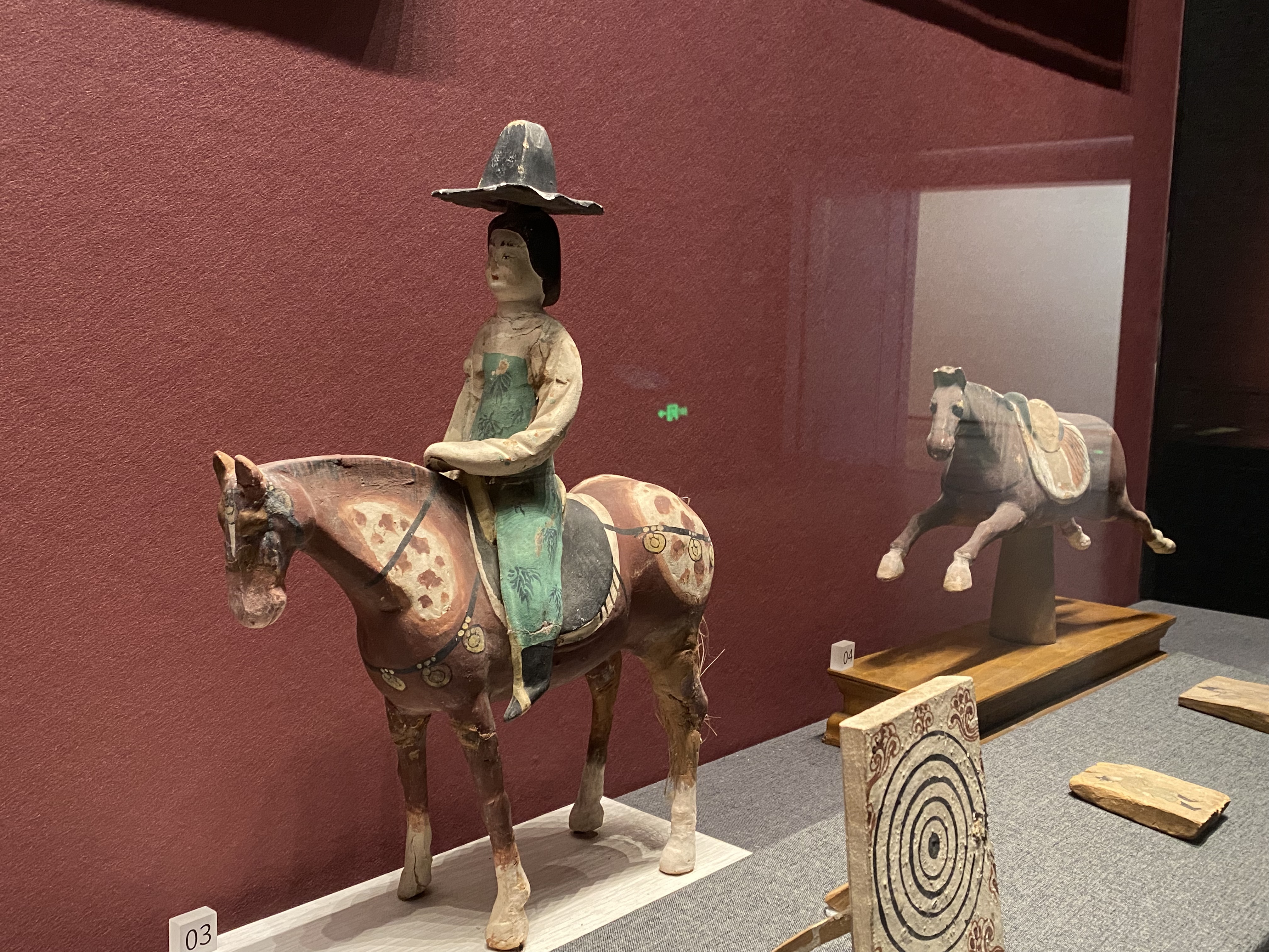 新疆博物馆陈列的彩绘戴帷帽骑马仕女俑。石榴云/新疆日报记者 赵梅 摄