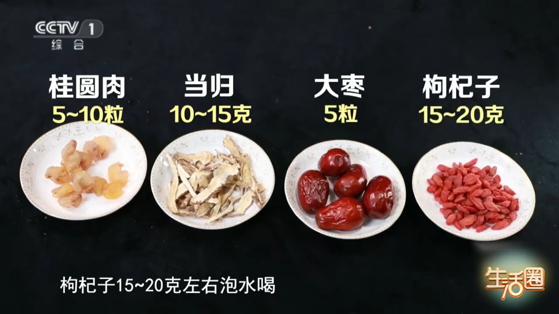 医生推荐“女人四大宝”。取桂圆肉5~10粒、当归10~15克、大枣5粒、枸杞子15~20克,代茶饮用。