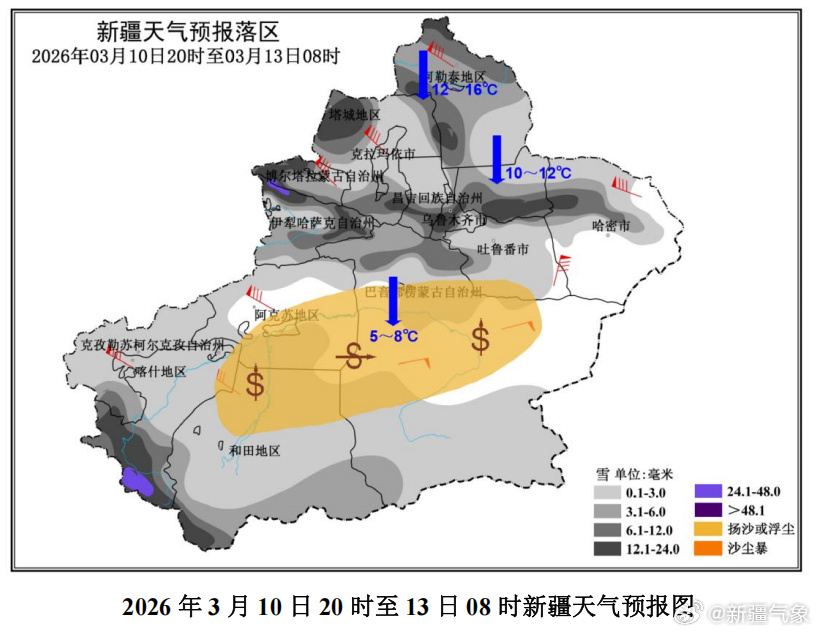 据新疆气象台预报,此次寒潮天气过程核心时段为3月10日至13日,全疆大部先后有小到中量雨或雨夹雪转雪,伊犁河谷北部东部、博尔塔拉蒙古自治州、塔城地区、阿勒泰地区北部、石河子市南部、乌鲁木齐市等地有暴雪,山区局地大暴雪。全疆大部先后有8—9级西北风和偏东风,风口风力10—11级,阵风13—14级,局地伴有风吹雪;南疆盆地有沙尘天气。