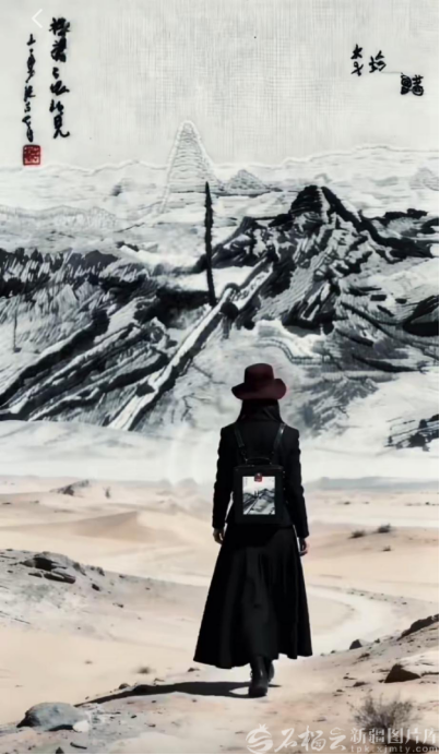 此次发布的数字文创作品,是在上述实体刺绣作品基础上进行的数字化升华。项目组联合知名设计师,完成手工真皮皮包设计制作后,进一步利用人工智能技术赋能,采用数字人物模特,将承载着水墨丹青意境与细腻针法的刺绣作品,置入楼兰土垠、罗布泊、红柳滩等真实的历史遗址环境视频中。