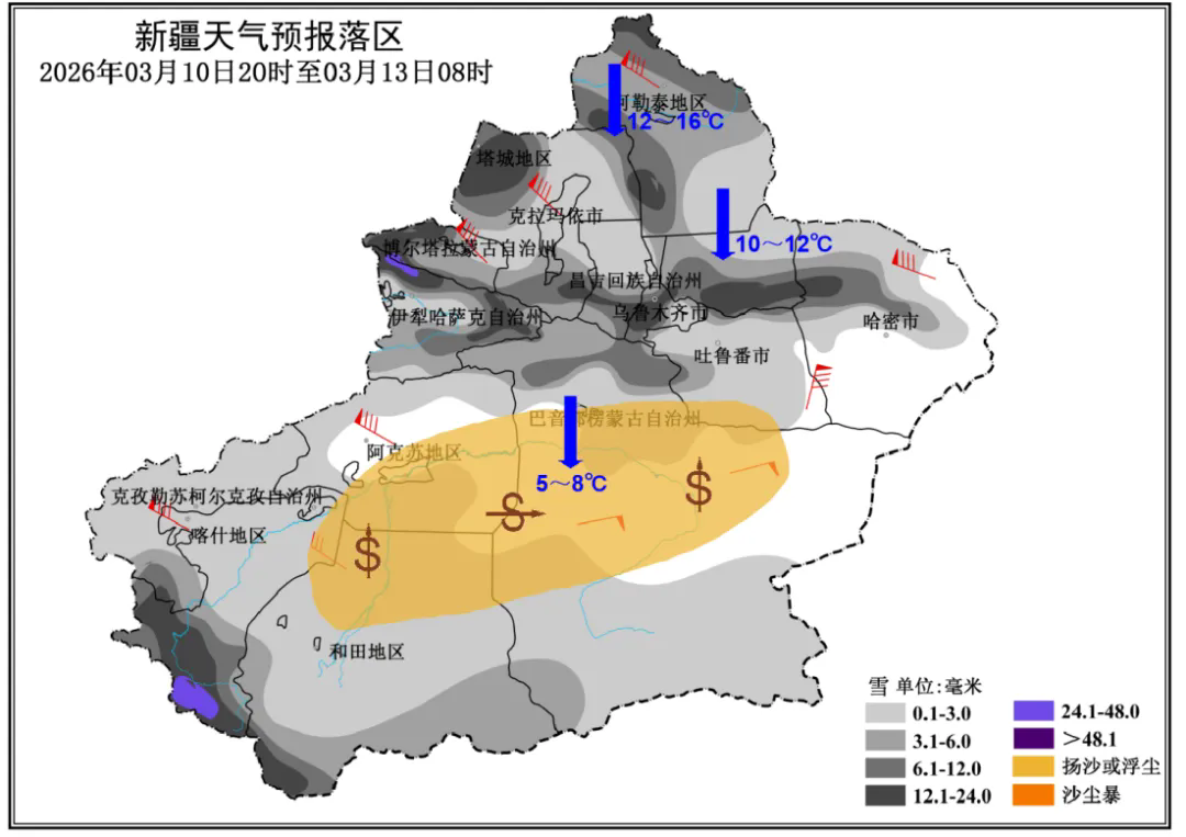据新疆气象台消息,3月10日夜间至12日白天,全疆大部先后有小到中量的雨或雨夹雪转雪,伊犁河谷北部东部、博州西部、塔城地区北部、阿勒泰地区、乌鲁木齐市山区、昌吉州南部山区、喀什地区南部山区暴雪,其中伊犁河谷北部山区、喀什地区南部山区局地大暴雪,累计降雪量15~25毫米、新增积雪10~30厘米。强降水时段:伊犁河谷、博州、塔城地区、阿勒泰地区在10日夜间,乌鲁木齐市、昌吉州在11日白天,喀什地区南部山区在10日夜间至11日夜间。