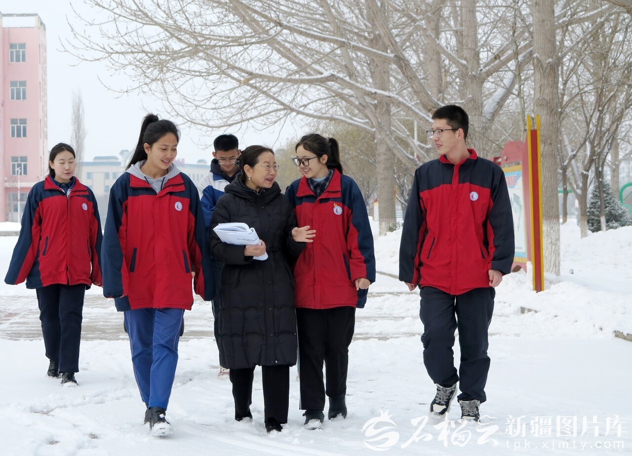 2月13日,住疆全国政协委员关芳芳(中)与察布查尔锡伯自治县高级中学高三学生交谈。石榴云/新疆日报记者 邹懿摄