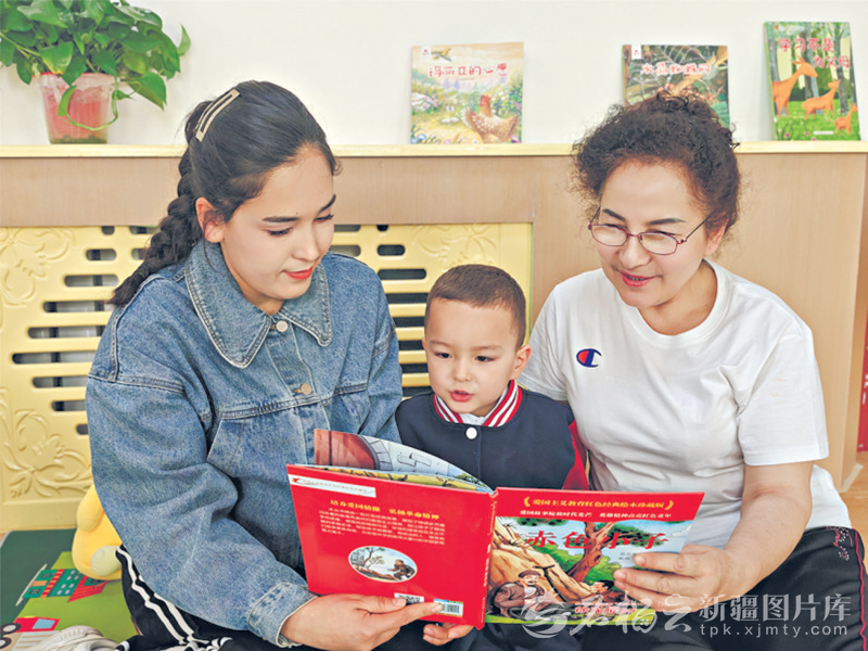 在阿瓦提县第一幼儿园图书室里,小朋友和家长一起阅读书籍。 □包良廷摄