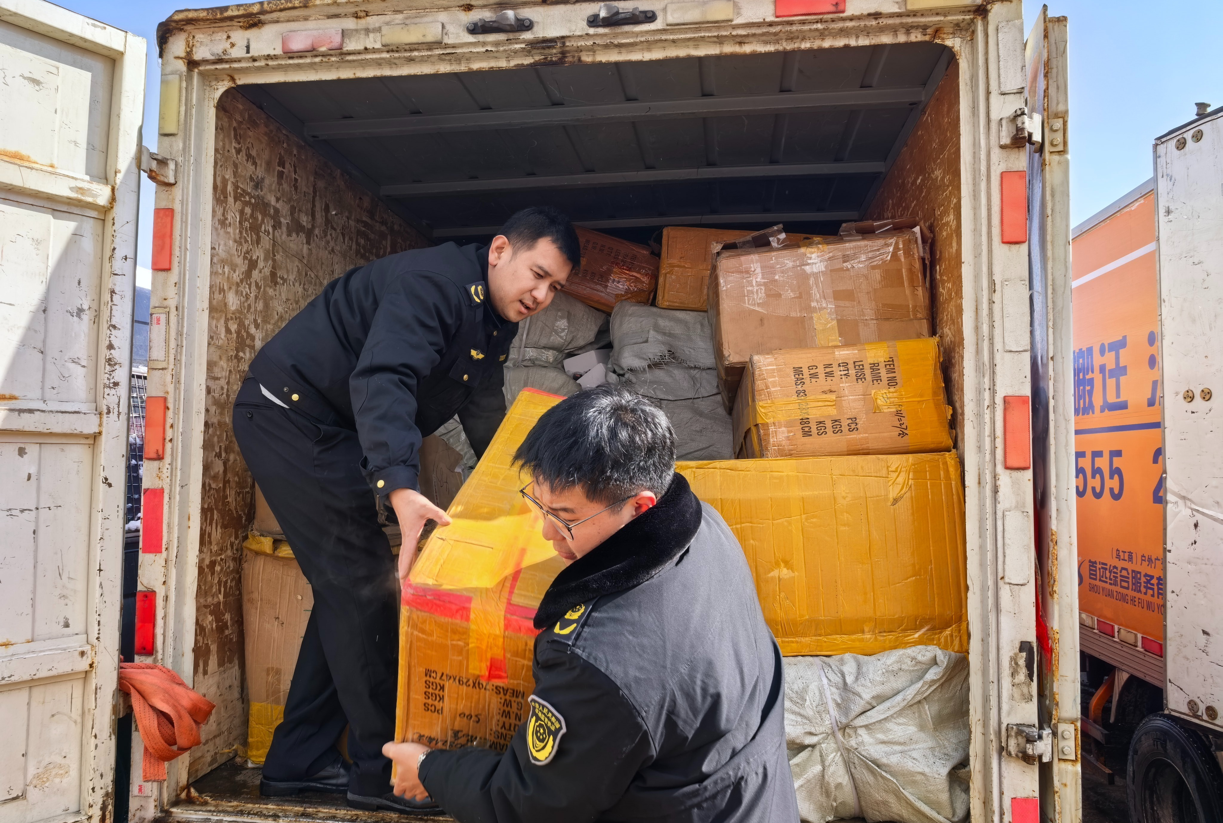 销毁现场,市场监管部门工作人员搬运待销毁的物品。石榴云/新疆法治报记者 龚彦晨摄