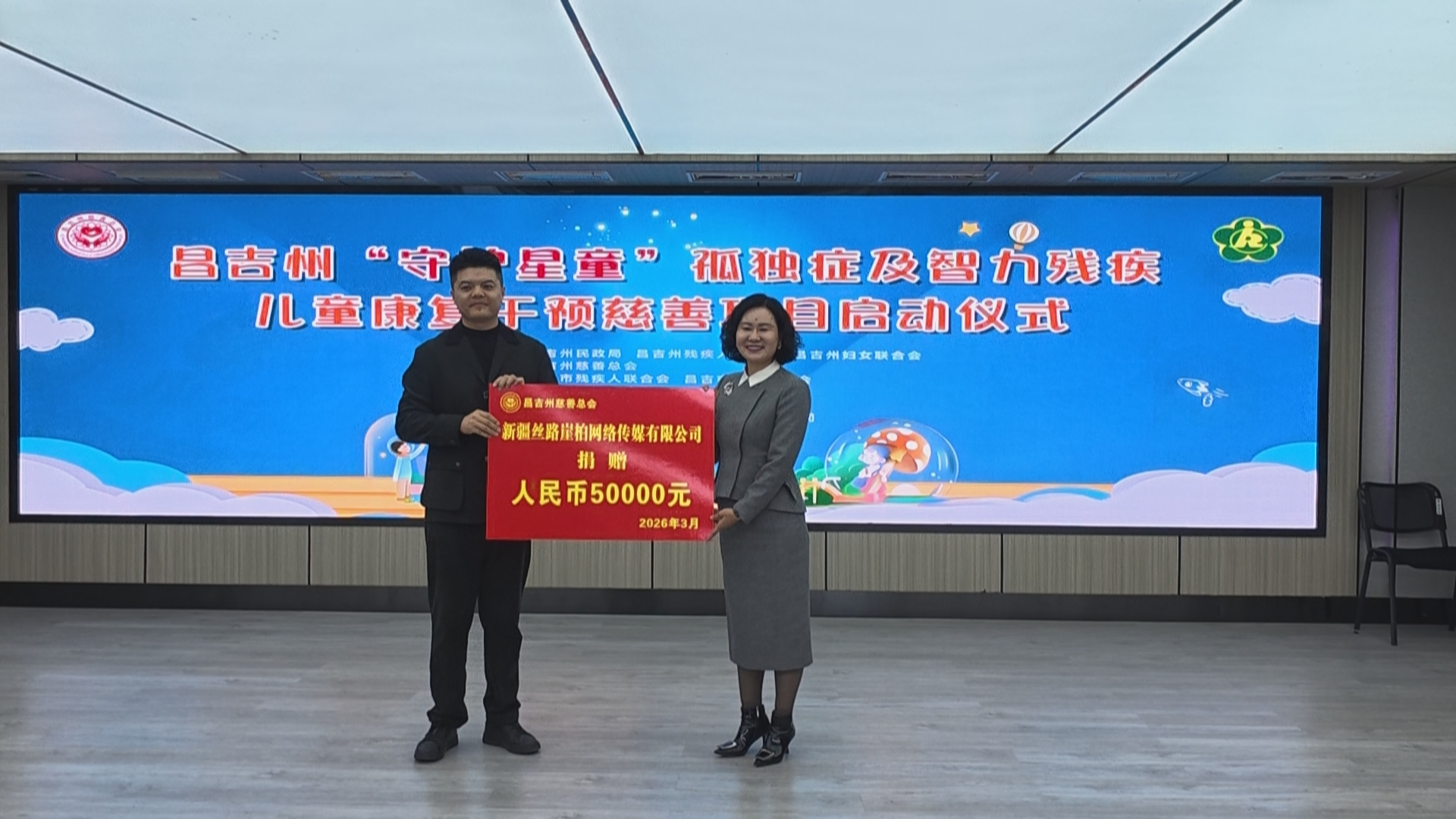 新疆丝路崖柏网络传媒有限责任公司向昌吉州慈善总会捐赠5万元项目启动资金。张楼摄