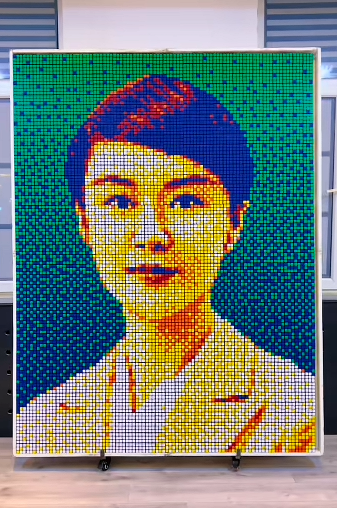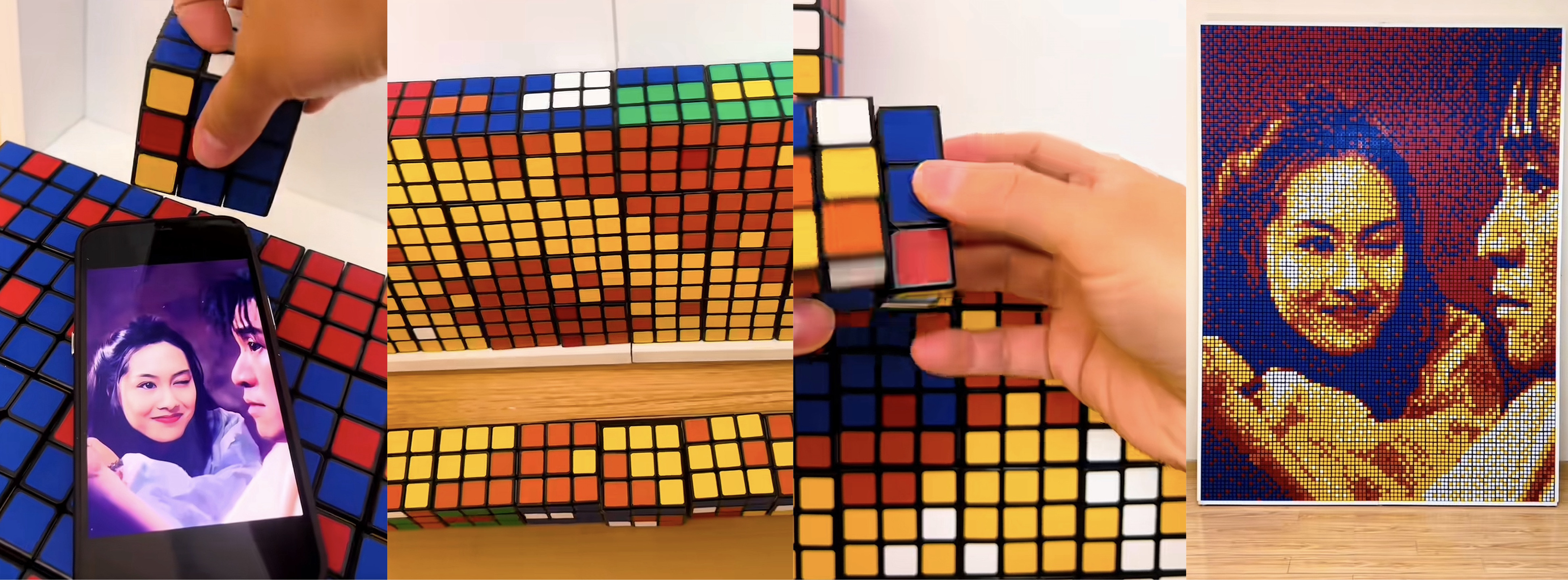 视频中,该博主以紫霞仙子眨眼瞬间为原型,通过调整1200块魔方的色块朝向,逐格拼出人物轮廓、神态细节及光影层次。随着镜头推进,由红、黄、紫等色块构成的画面中,紫霞仙子眉眼流转、顾盼生辉,经典眨眼动作被定格为可触摸的立体像素艺术。