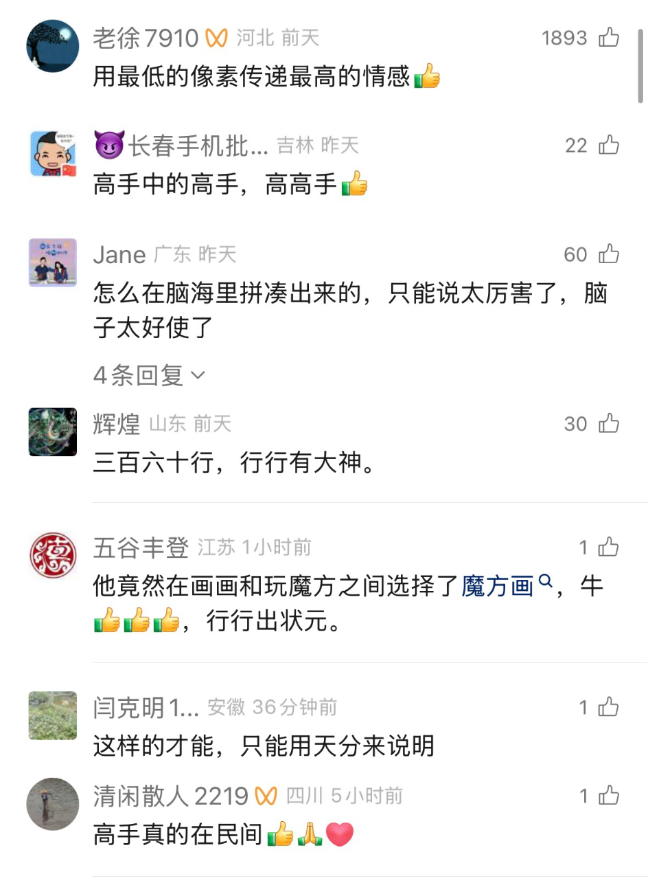 正如网友所说:“有些记忆会褪色,但有人愿意用方寸之间的坚持,帮我们把它留住。”他的下一组1200块魔方,又会拼出谁的模样?期待博主下一次的创作。
