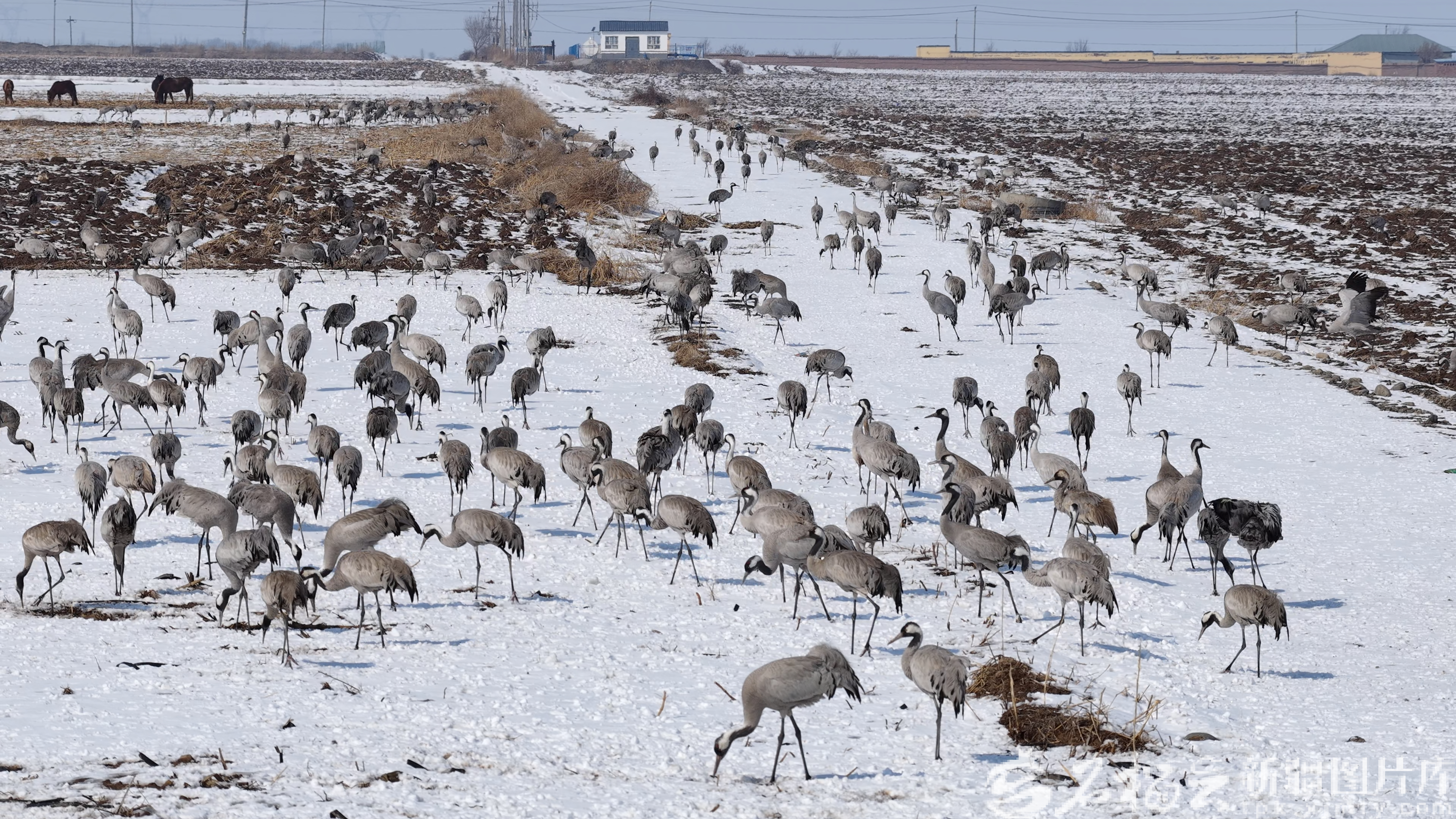 在呼图壁县,大群灰鹤正在雪地觅食。杨勇摄