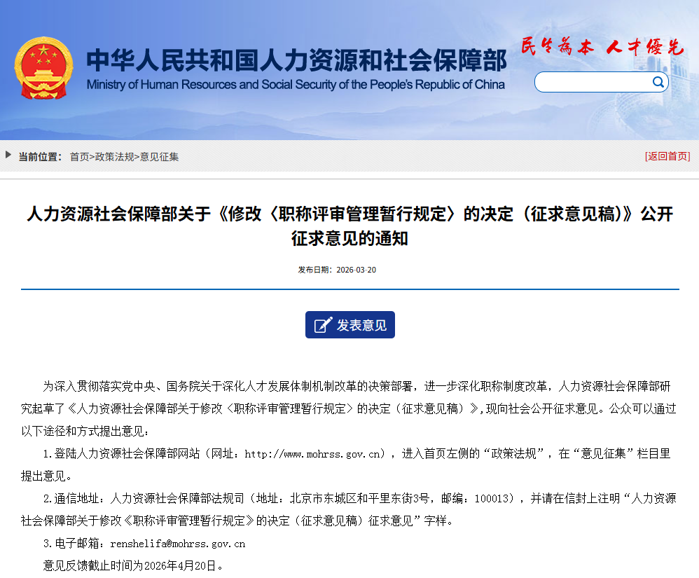 为深入贯彻落实党中央、国务院关于深化人才发展体制机制改革的决策部署,进一步深化职称制度改革,人力资源社会保障部研究起草了《人力资源社会保障部关于修改〈职称评审管理暂行规定〉的决定(征求意见稿)》,现向社会公开征求意见。公众可以通过以下途径和方式提出意见: