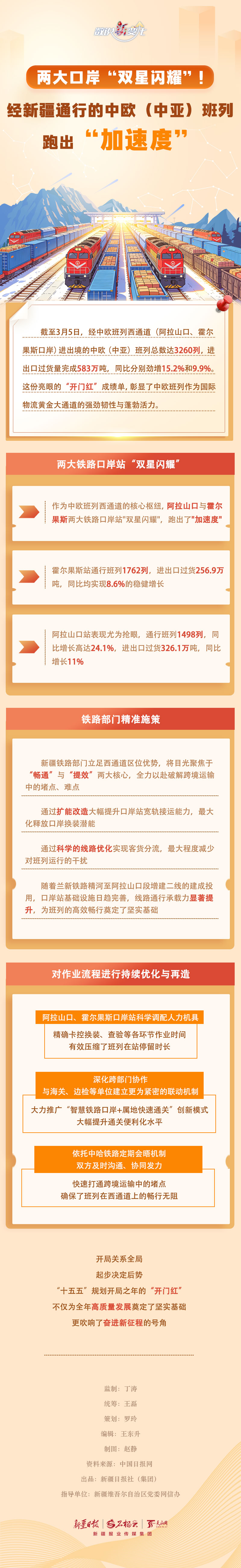 A+ A. A-截至3月5日,今年经中欧班列西通道(阿拉山口、霍尔果斯口岸)进出境的中欧(中亚)班列总数达3260列,进出口过货量完成583万吨,同比分别劲增15.2%和9.9%。作为中欧班列西通道的核心枢纽,阿拉山口与霍尔果斯两大口岸表现如何? 新疆铁路部门为保障班列高效畅行做了哪些努力?本期《数说“新”变化》一起来看看。
