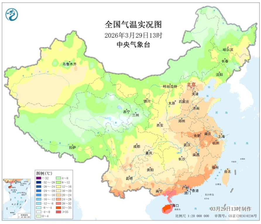 看看今天13时的气温实况图