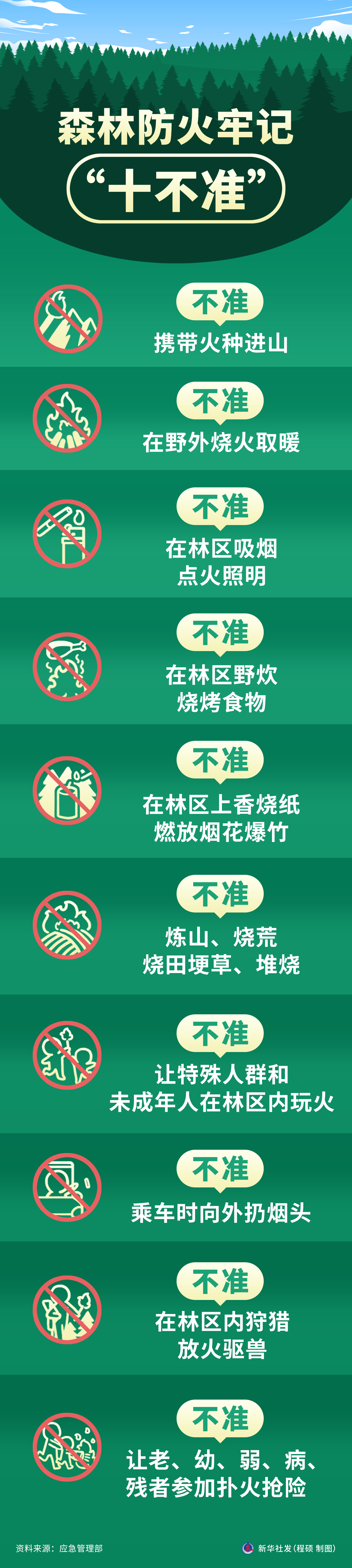 春季是森林火灾的高发期。森林防火,人人有责。请谨记森林防火“十不准”,增强防火安全意识,严格遵守防火规定。