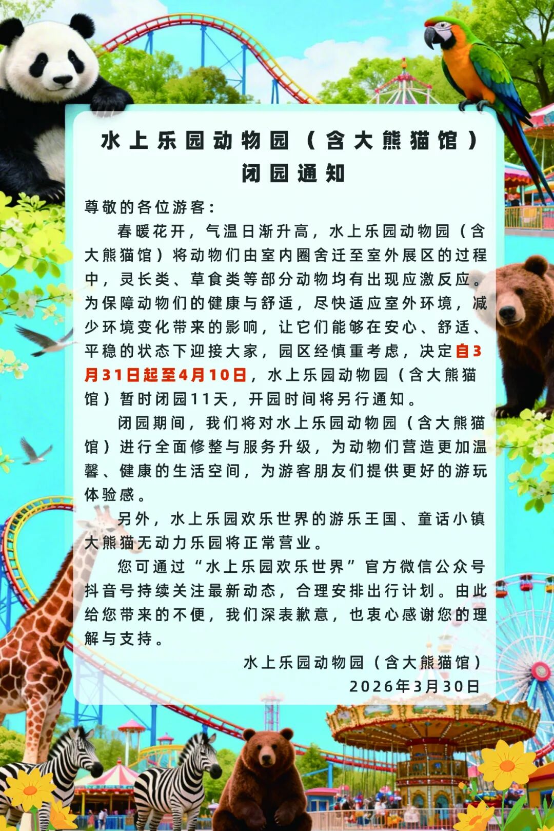 今起,乌鲁木齐水上乐园动物园(含大熊猫馆)暂时闭园!