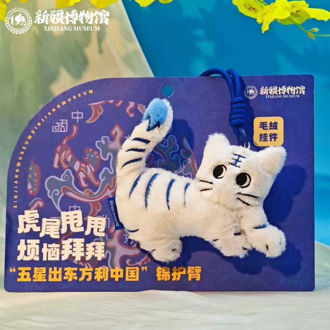 两千年前,一句“五星出东方利中国”的占卜吉言,被精心织入锦缎,沉睡于尼雅遗址的黄沙之下;两千年后,这句古老祝福跨越时空,化作一只软萌白虎毛绒挂件,成为人们背包上的亮眼装饰。
