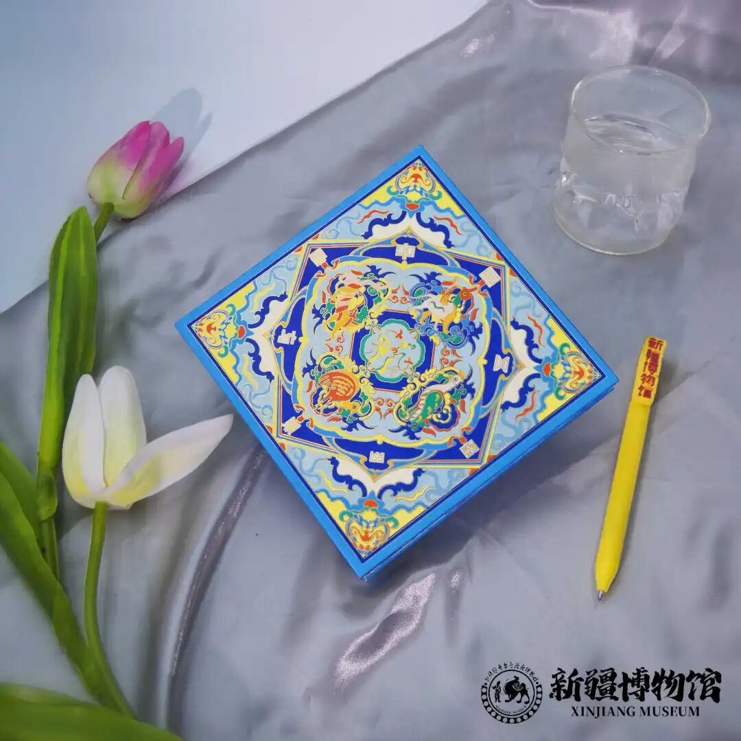 与白虎挂件同步推出的,还有一款质感出众的方形笔记本。封面采用纹理特种纸,朱红、靛蓝、杏黄的配色通过烫印工艺精准呈现,凑近可触摸到星辰与云气的暗纹肌理。新疆博物馆文创部负责人表示,两款文创产品的创作初衷简单而坚定:既要守住文物的文化内核,又要兼顾实用性,让国宝走出展柜,真正走进大众生活。
