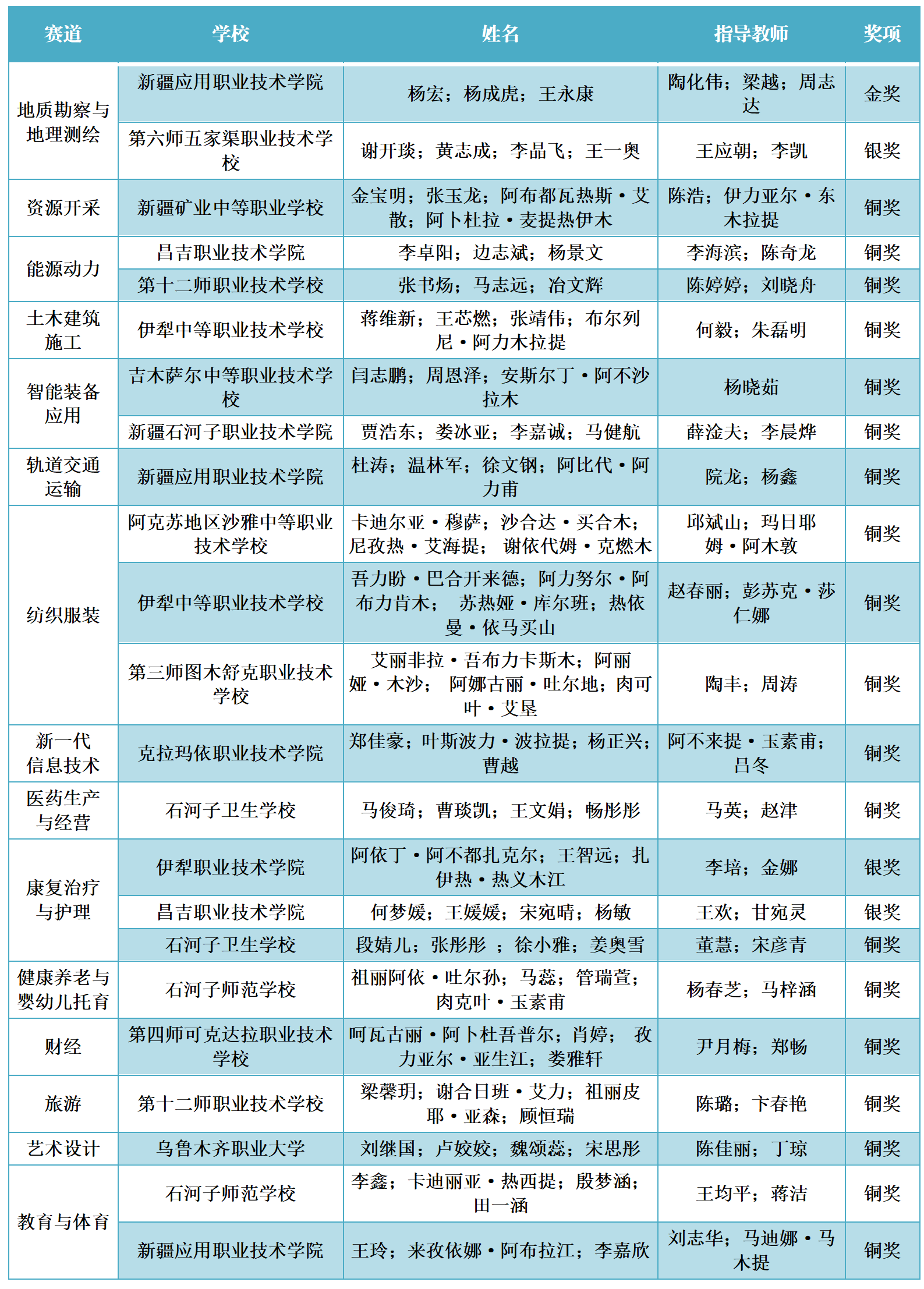 名单显示,此次大赛争夺赛中职组(不含人工智能赛道)中,新疆(含兵团)有16所院校获得23个奖项(具体名单如下),其中新疆应用职业技术学院在地质勘察与地理测绘赛道获得金奖。