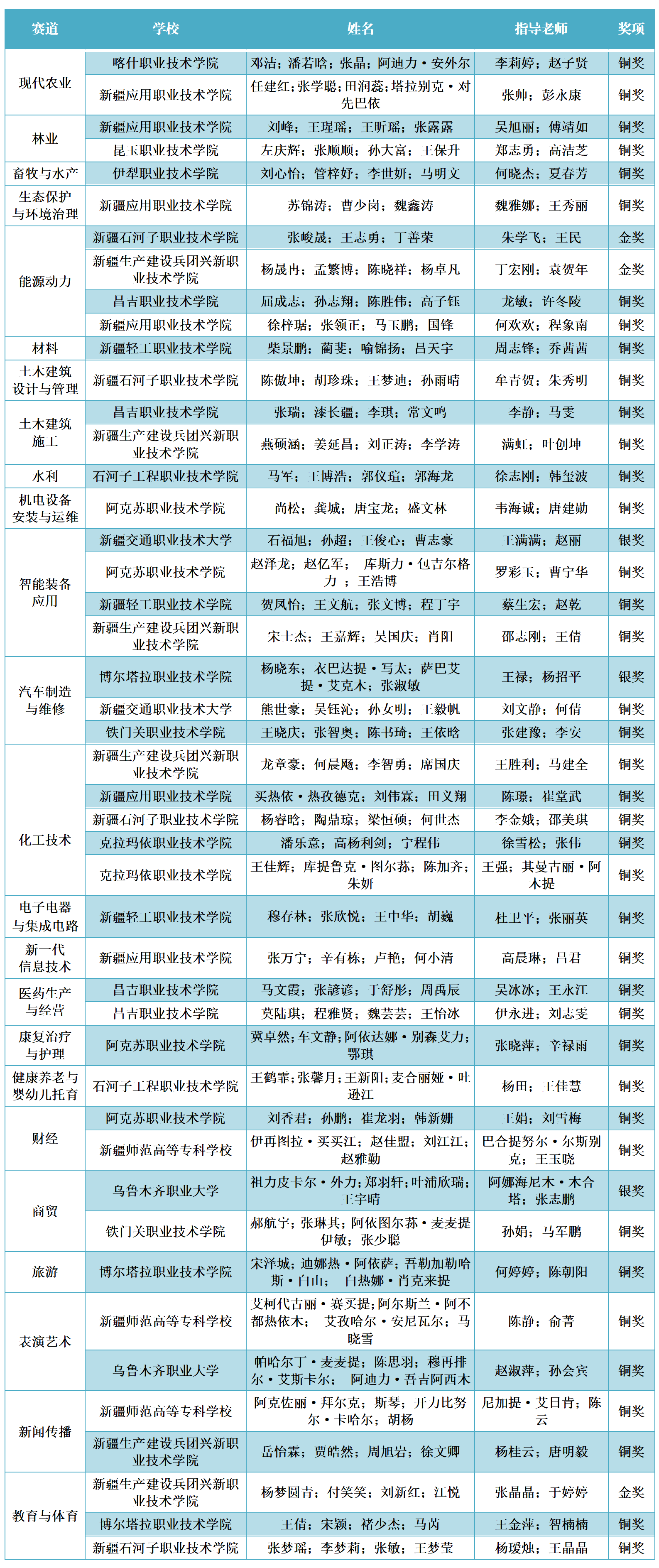 大赛争夺赛高职组(不含人工智能赛道)中,新疆(含兵团)有16所院校获得46个奖项(具体名单如下),其中金奖3个,分别是新疆石河子职业技术学院、新疆生产建设兵团兴新职业技术学院能源动力赛道金奖,新疆生产建设兵团兴新职业技术学院教育与体育赛道金奖。
