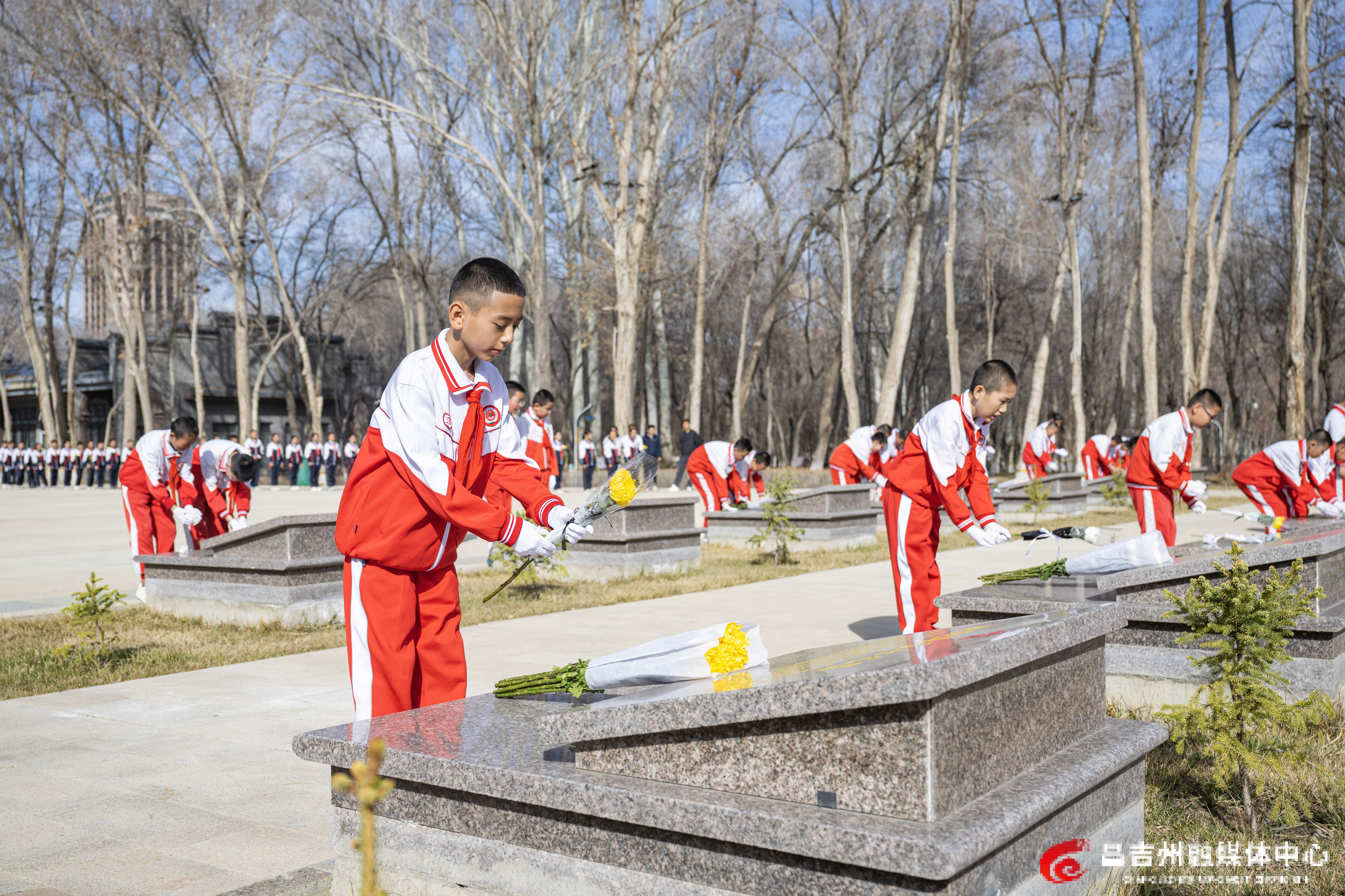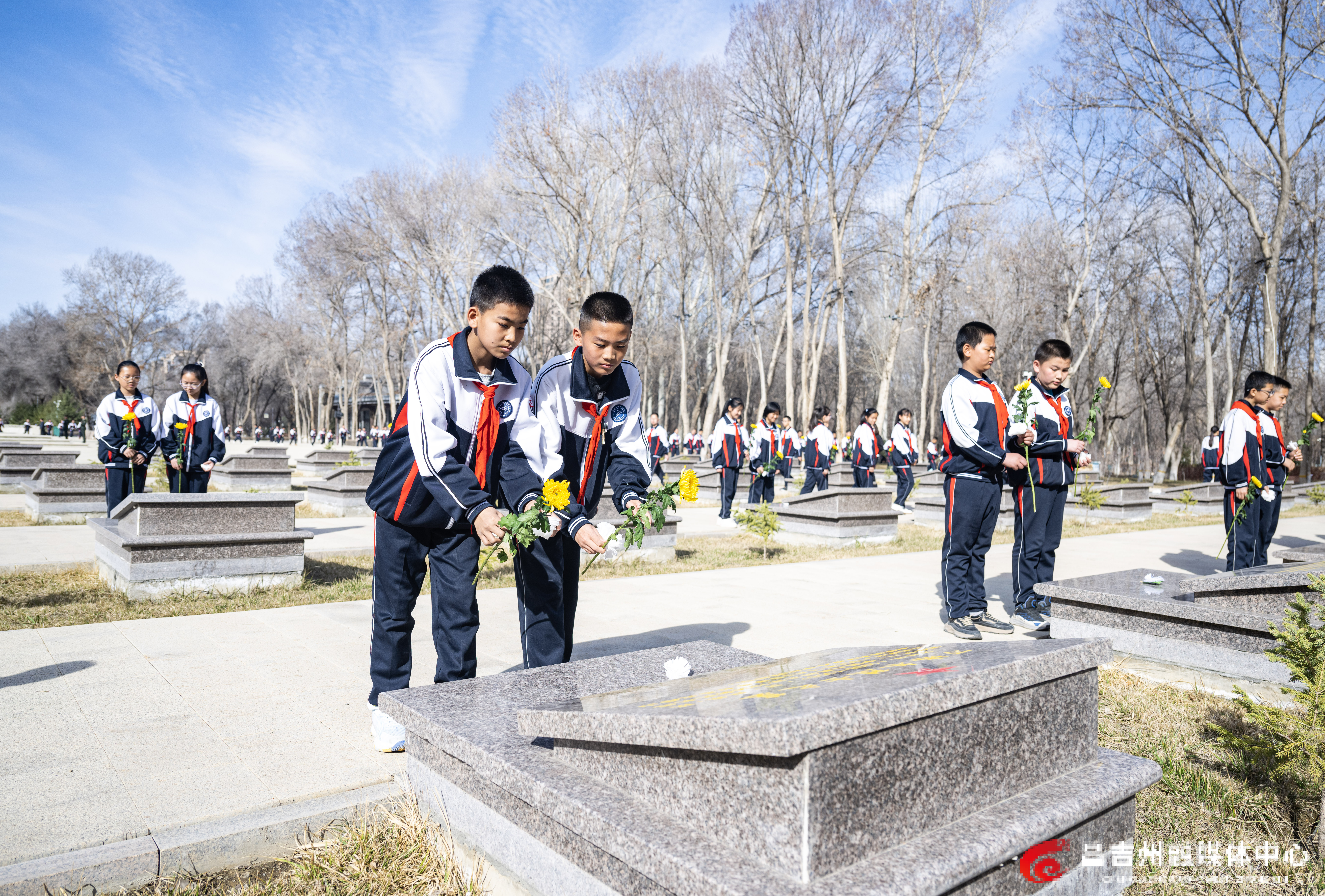 4月1日,奇台县烈士陵园,学生向烈士墓献花。
