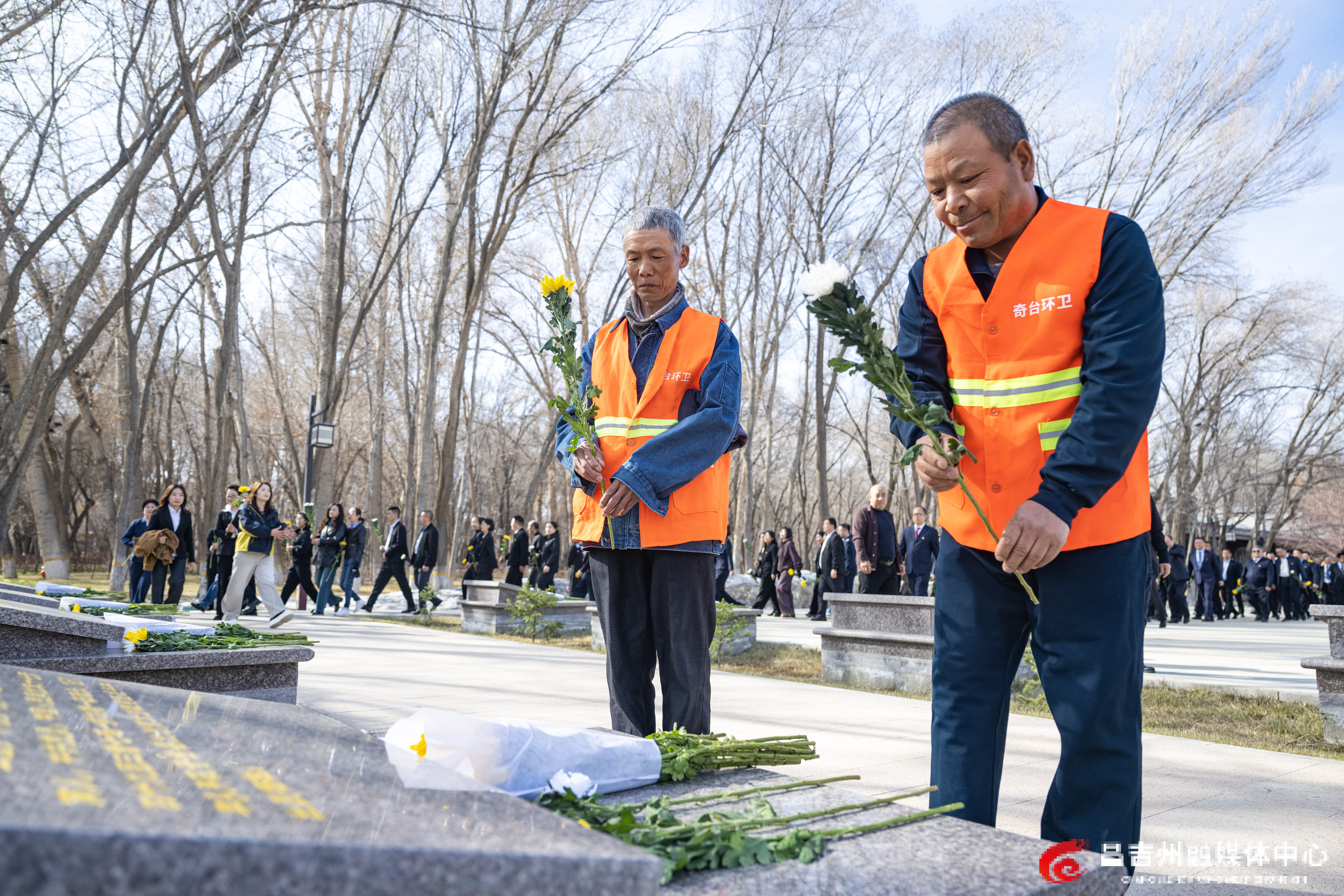 4月1日,奇台县烈士陵园,环卫工人向烈士墓献花。
