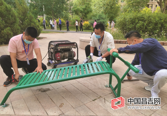6月9日,昌吉州艺术剧院驻昌吉市建国路街道丽景社区“访惠聚”工作队队员在特变·世纪广场小区安装室外健身器材。 记者 吴茜 摄
