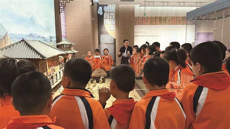 4月12日,昌吉市第一小学在昌吉博物馆开展思政课研学活动,学生们聆听博物馆讲解员讲解。 □武思菀摄